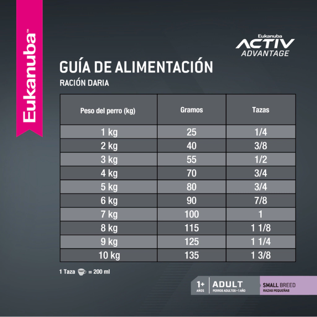 Alimento balanceado completo para perros adultos de raza pequeña como Caniche, Yorkshire Terrier, y otras razas o perros mestizos que pesan menos de 10 kg. Recomendado para perros adultos mayores a 12 meses de edad. Fuente de proteína con un alto porcentaje de aminoácidos esenciales altamente digestibles, que contribuyen a desarrollar y mantener músculos magros. La combinación de diferentes tipos de granos de cereal permite mantener niveles de actividad saludables entre comidas, con un menor tamaño de ración. Viene en presentación de 1 KG, 3 KG, 7.5 KG y 15 KG.