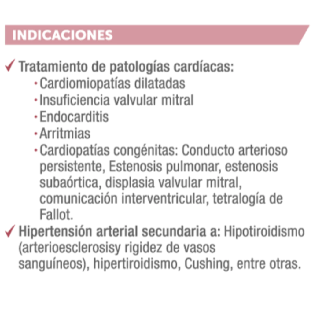 MV CARDIACO es adecuado para perros de todas las edades que sufren de cardiomiopatías dilatadas, insuficiencia valvular mitral, arritmias, y otras condiciones cardíacas. También es indicado para casos de hipertensión secundaria a hipotiroidismo, hipertiroidismo, Cushing, entre otras.