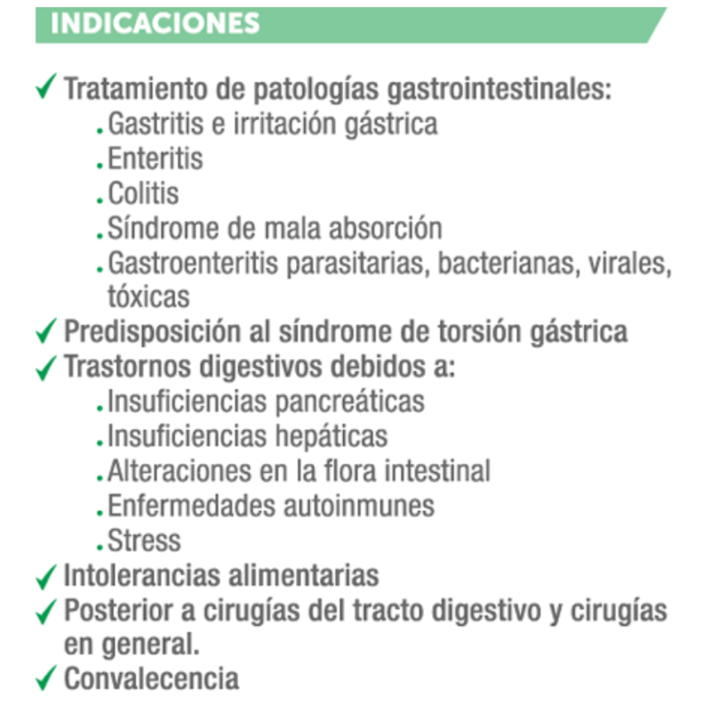 Gracias a su alta digestibilidad y bajo residuo, maximiza la absorción de nutrientes esenciales y colabora eficazmente en la recuperación de mucosas irritadas. La fórmula incluye glutamina, que favorece el tropismo del epitelio del duodeno y yeyuno, y butirato de sodio, reconocido por su acción antimicrobiana e inmunomoduladora.
