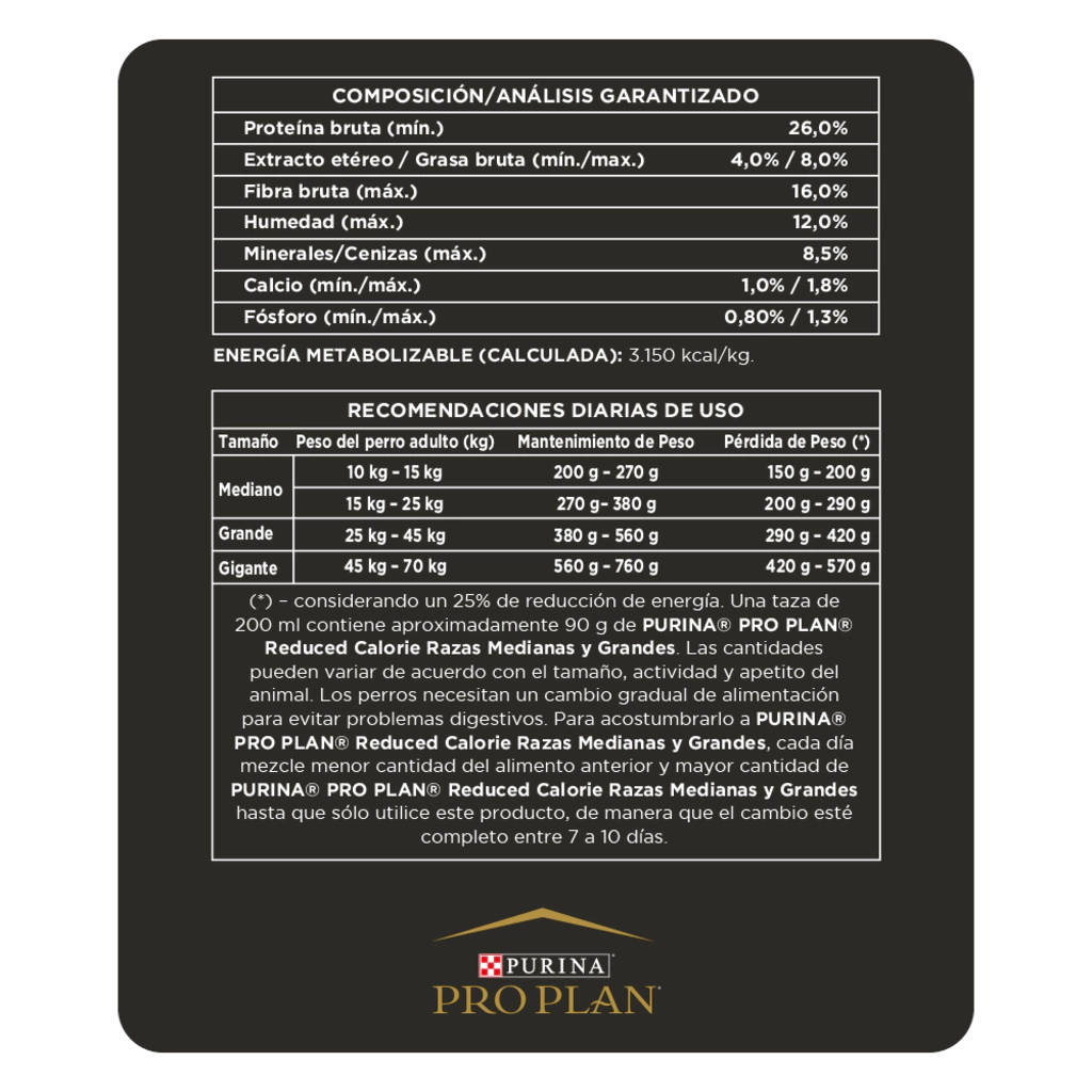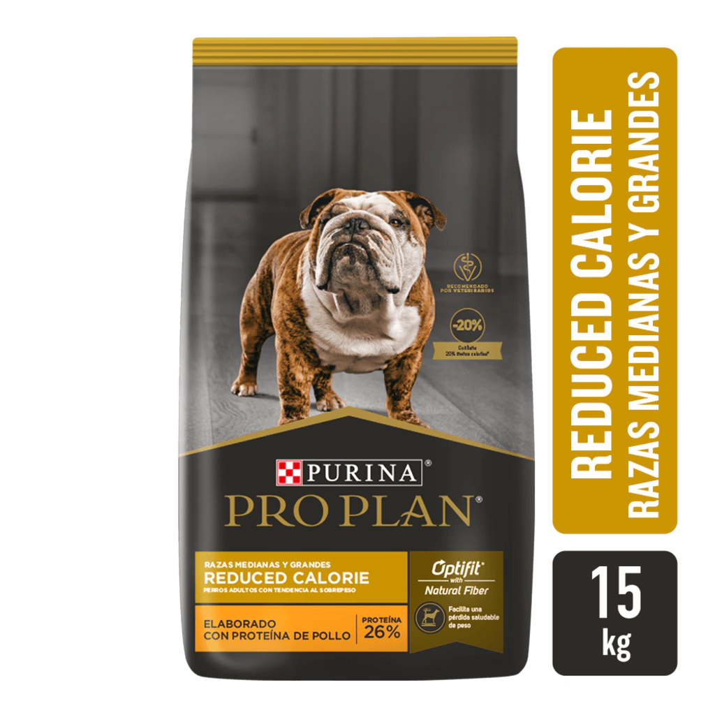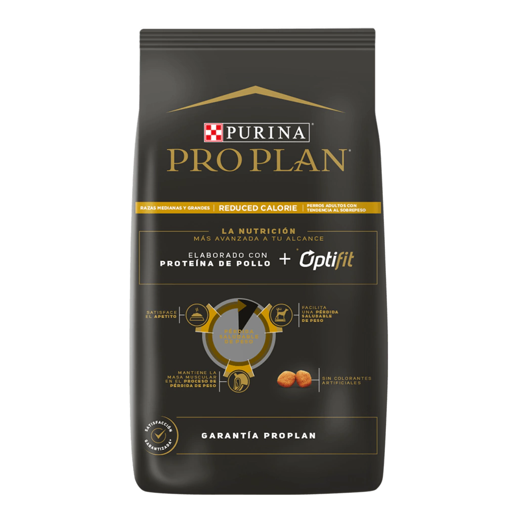 Fórmula de vanguardia que ayuda a lograr un peso corporal ideal, facilita la pérdida de peso de manera saludable y protege a largo plazo la salud general de tu perro. Mantener un peso corporal saludable y una condición corporal magra son aspectos vitales para mejorar la salud y aumentar la longevidad de tu mascota. PRO PLAN® Reduced Calorie con OptiFit® proporciona nutrición con tecnología de vanguardia para el manejo de un peso saludable. Esta fórmula facilita una pérdida de peso saludable al contener un 20% menos de calorías que un alimento de mantenimiento para perros adultos. Está formulado con un alto contenido de proteínas para ayudar a mantener la masa muscular mientras se reduce la grasa corporal, asegurando así una nutrición óptima para tu perro. Además, contiene una fuente natural de tres tipos de fibras que sacian el apetito, manteniendo a los perros satisfechos y apoyando el proceso de pérdida de peso de manera controlada. Opta por PRO PLAN® Reduced Calorie con OptiFit® para cuidar la salud y el peso de tu perro. Disponible para satisfacer las necesidades nutricionales específicas de tu mascota.