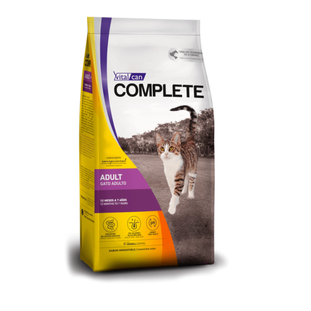 Vitalcan Complete es ideal para gatos adultos de 12 meses a 7 años porque les proporciona:Protección sistema digestivo: Con ingredientes naturales como los prebióticos que mejoran la microbiota intestinal, logrando una mejor digestibilidad y absorción de los nutrientes.Piel Saludable – Pelaje brillante: El aceite de pollo, fuente de omega 6, brinda humectación a la piel y brillo al pelaje.Urinary tract Health: Formulado con un mix de ingredientes que permite lograr un pH urinario ideal y así ayudar a evitar la formación de cristales y/o cálculos urinarios, con Hairball Control.